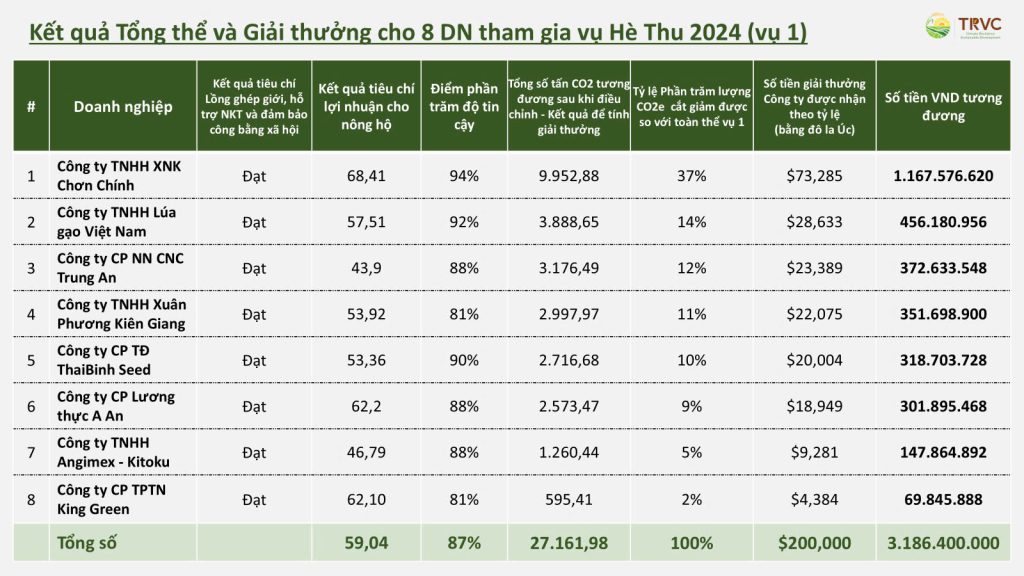 Công ty TNHH Xuất nhập khẩu Chơn Chính là đơn vị đã đạt được số tiền thưởng cao nhất, với hơn 1,16 tỉ đồng, công ty đã đăng ký dự thi với diện tích hơn 1.514ha, đạt mức giảm phát thải khí nhà kính trung bình 6,57 tấn CO2/ha và lợi nhuận trung bình của nông hộ đạt 68,41%.